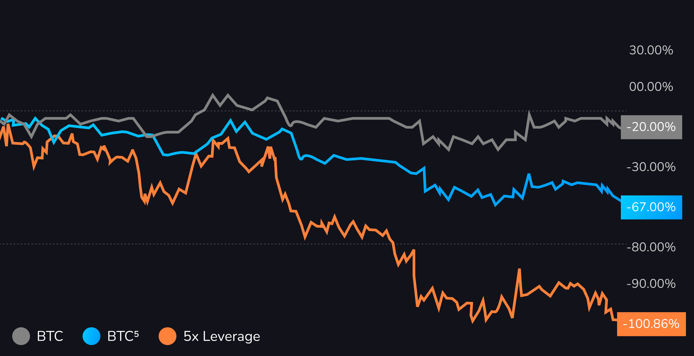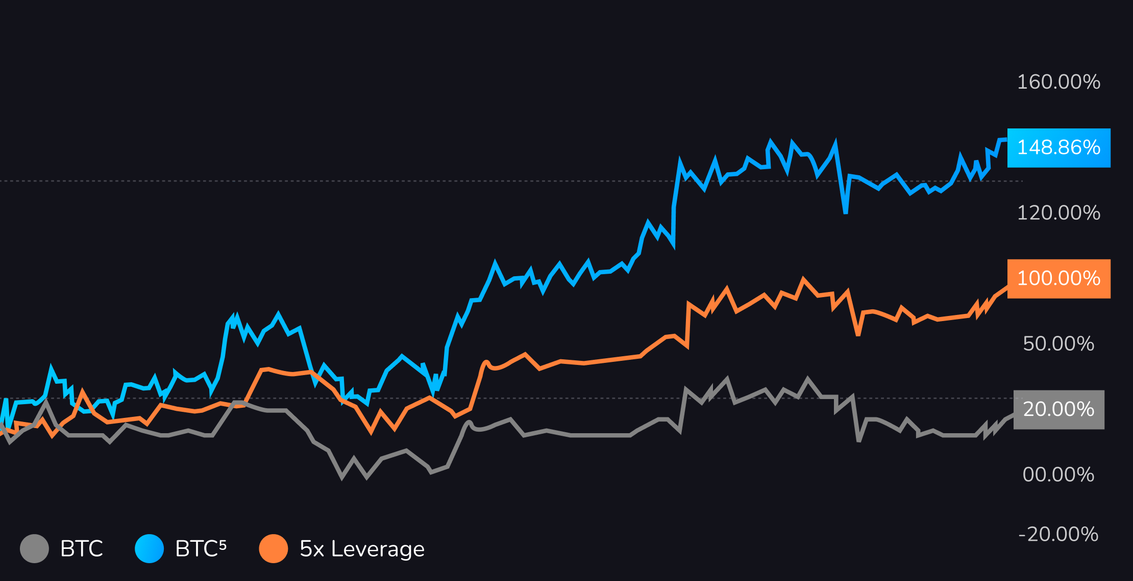 For example, let’s compare the risk-return profile of 5x leverage with BTC⁵, a power derivative on Genie DEX:&#x20;